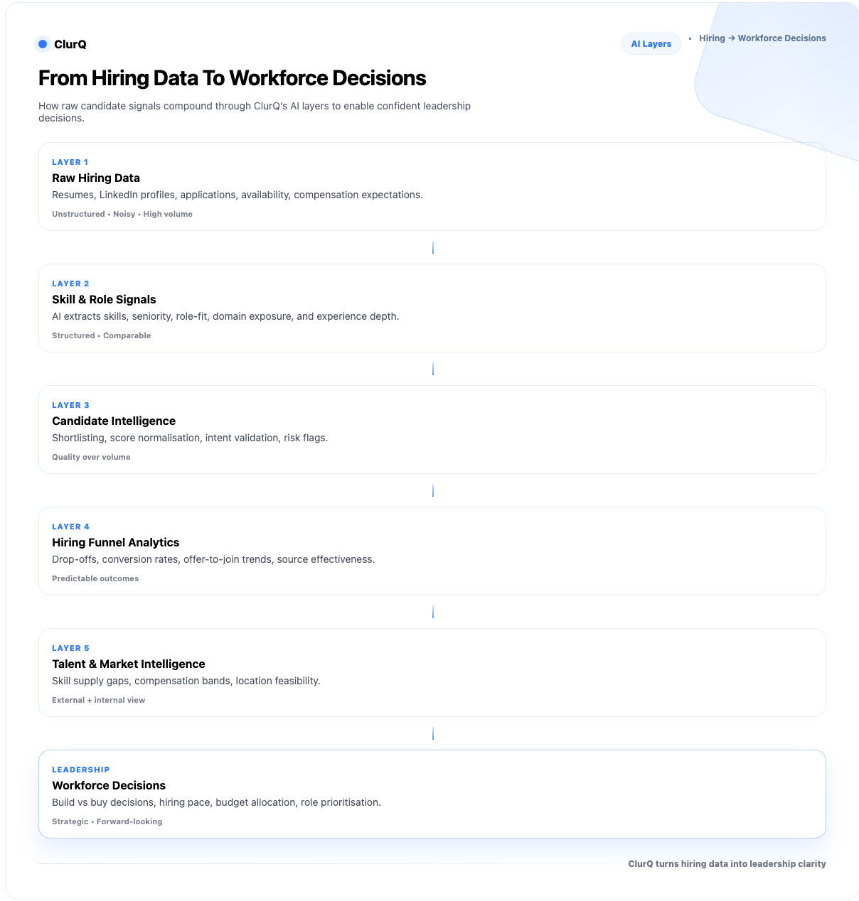 ClurQ embeds AI within governed decision loops rather than autonomous flows. Recruiters, hiring managers, and business leaders retain explicit responsibility across each approval stage. AI outputs surface insights, confidence markers, and risk flags, yet final judgement always sits with accountable stakeholders. This structure prevents blind reliance while preserving efficiency gains.